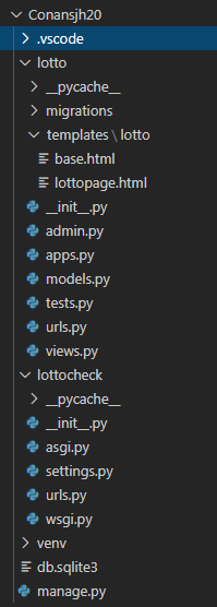 앱폴더(lotto)에 templates폴더를 만들고 그 안에 앱 이름과 동일한 lotto 폴더를 만들어 html 두개를 집어 넣었습니다.